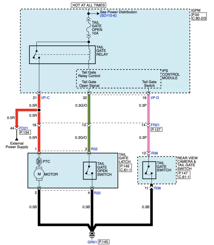 R32 (Tailgate open switch pin 3 and 4) is the one I am thinking and the wiring diagram confirmation is appreciated. R36 not sure of (maybe signals as John Lumsden above post) At least the wiring color code should help.This might help, EE. It's fooling the IPS Control Module firmware that's the concern.