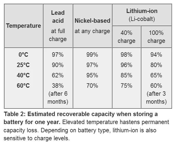 Table 2: Estimated recoverable capacity when storing a battery for one year... Depending on battery type, lithium-ion is also sensitive to charge levels.