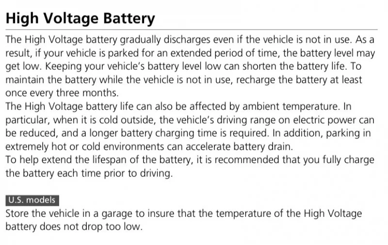 Here’s the complete wording from the manual. It actually recommends to recharge the battery “at least every three months” if the vehicle is left to sit unused for an extended period. While it does not define “recharge” it would not be unreasonable, in my opinion, to interpret that to mean a full charge, which the BMS regulates to ~90% or 4.09x VDC per cell.