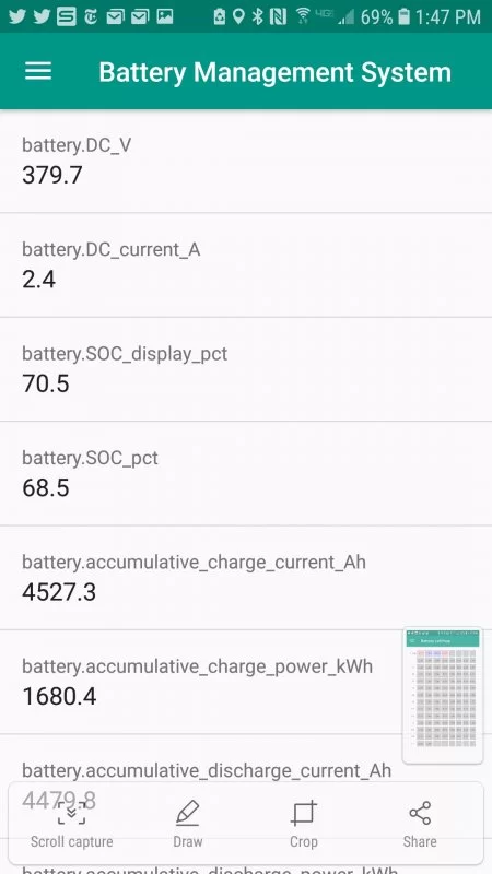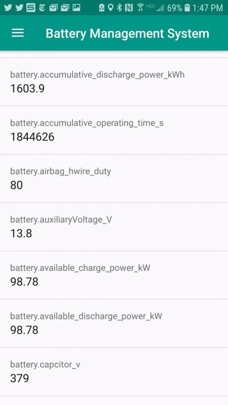 Evaporator temp was 41F - that sounds normal enough for a hot day like this with the compressor running. Cabin temp of 82F doesn't sound that bad. Now let's look at the BMS (5 pages of data):