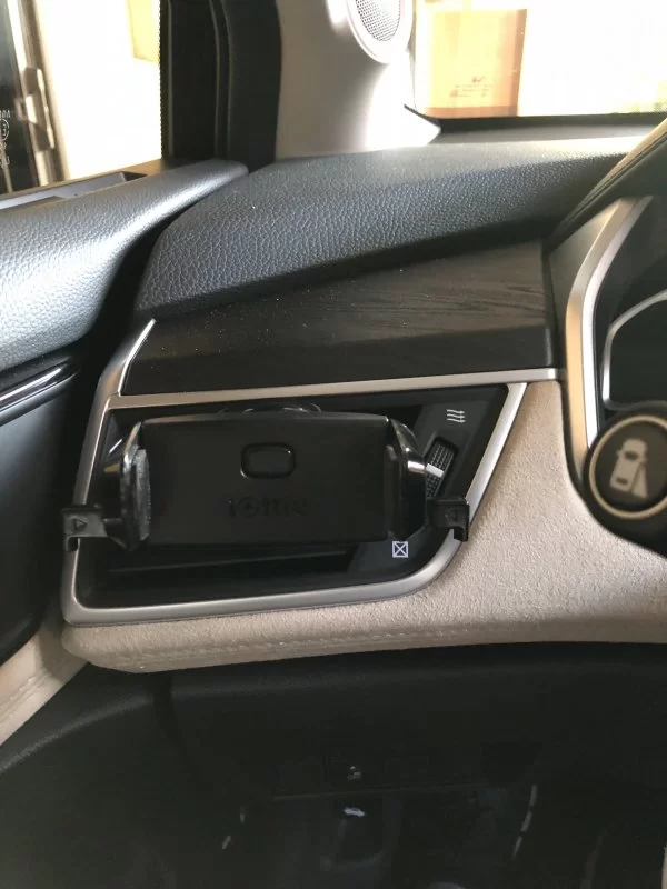 I've placed a magnetic mount on the left-hand side of the 'bridge' and I simply place my phone on that when I enter the car. I'm using a Vava Magnetic Phone Mount for this purpose. The mount includes a thin metal disc that I've attached to the inside of my phone case.