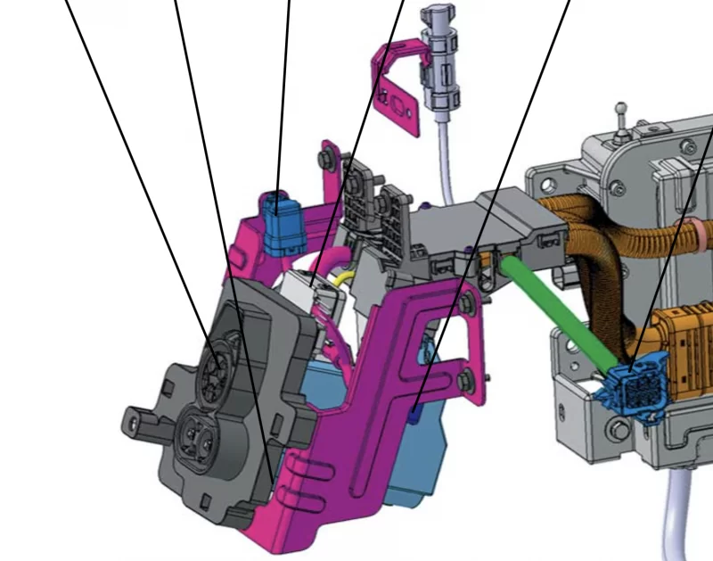 Looking at the docs it's clear that the port itself is not mechanically or electrically connected to the door assembly. Not unexpectedly, it appears that they procure the port as a standard assembly and the body designers provided the opening in the bumper to access and protect it. The port is attached to the front metalwork while the door is fitted to the inside of the urethane bumper.