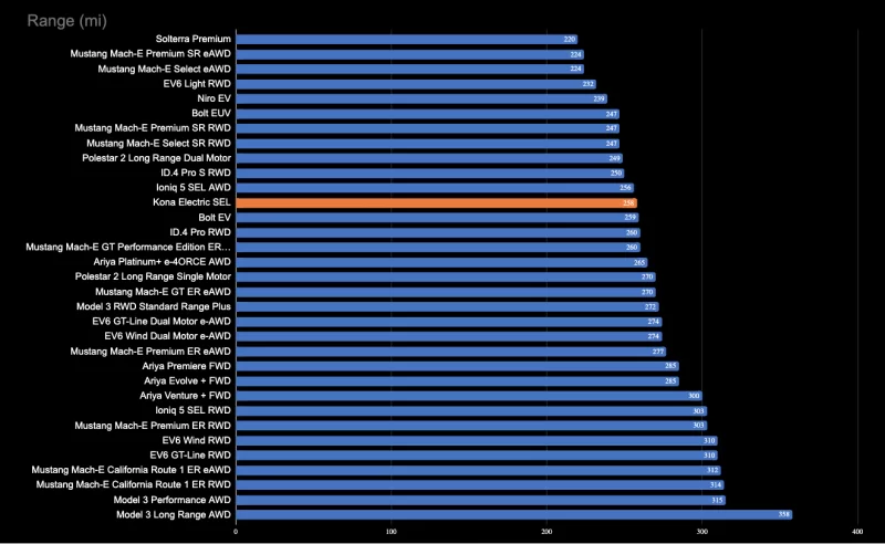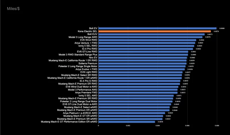 Trying to make sense of what to replace it was making my head spin, so I decided to build a spreadsheet to help make with the decision. As soon as I'd done this, InsideEVS published this Comparison. Unfortunately, it doesn't compare the things I was interested in looking at. For example, what's the best range per dollar (the cheapest car with the longest range)? Which EV has the best power/weight ratio?