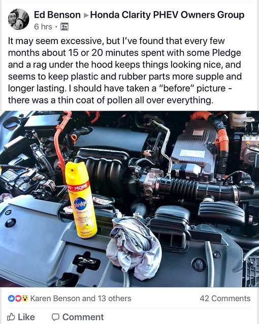 This morning I washed our Clarity. When checking the oil, I noticed pollen was coating much of the engine compartment. So I did what I usually do, and posted to Facebook about it: