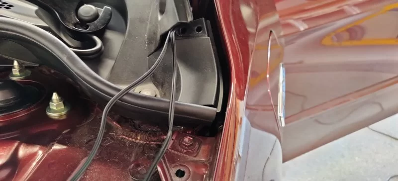 Wire coming out in engine bay. Those rubber spacers are a pain to reconnect. I'm thinking about putting the wires under that seal across the front.