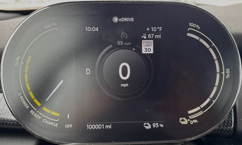 Since this was taken I've put on another 1500 miles or so. Don't worry about the e-power, this was taken during a prolonged polar vortex period and the 10 ºF shown was probably the warmest temperature for two weeks, so the batteries were cold-soaked even parked in a garage every night and charging before departure.