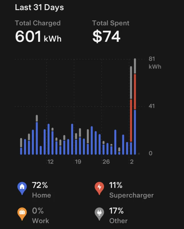 The $74 is a total cost over the previous 31 days, not a trip cost. Here are the trip Supercharger sessions: