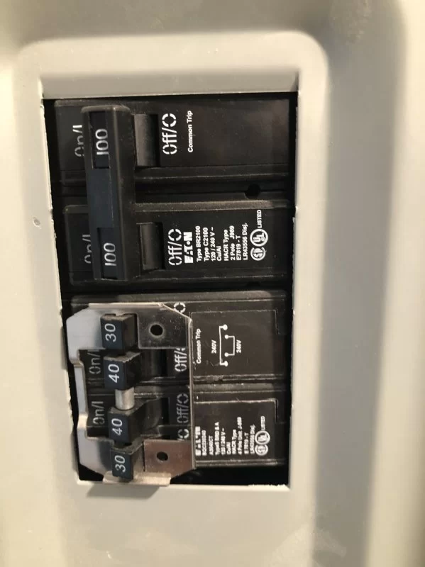 Can't tell from that picture. You've got two circuits there. A 30A circuit and a 40A circuit. You need to figure out which one feeds your dryer outlet. Text the outlet for voltage. Then turn off one set of switches at a time to see which circuit the dryer outlet is on. (220V circuit breakers have two poles. Your breakers have separate switches for each pole, and the two switches are interlocked, so that both 30s will operate together, and both 40s will operate together.)