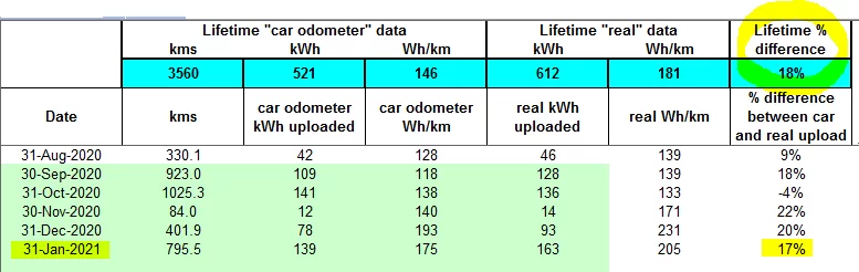 In the above screen shot of my spread sheet, for the month of January, the car odometer based uplift of 139 kWh is derived from 175 Wh/km multiplied by 795.5 km traveled (equals 139.2125 kWh, spreadsheet figures as shown are rounded for clarity).