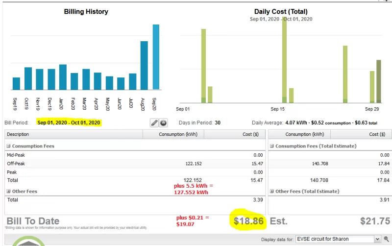 Note: the raw "Eyedro" monitoring system is displayed only for reference at this time. The 01-20 Aug 2020 data that shows up on this shot is because the sensor for the system was being used to monitor our kitchen stove...thus the total energy used shows "89.289 kWh" versus the raw "dumb" monitor that shows "80 kWh" that flowed from the circuit breaker panel towards the Kona.