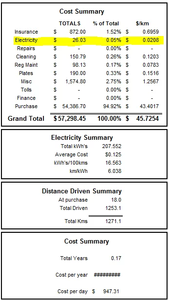 You should really separate your capital costs from your operating costs. Just take a fraction of the capital to represent the amortization amount for the time you own the car to add to your operating cost. That would make your final numbers look a bit more meaningful, esp that final Cost Summary box.