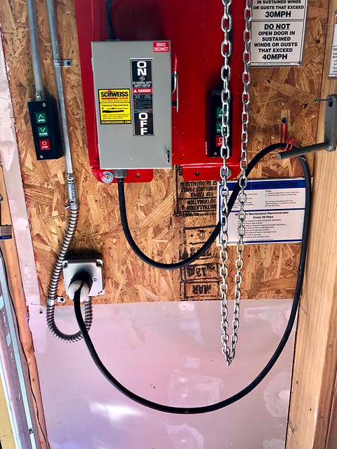 I wanted to have a way to open the hangar door in the event of a power failure. I envisioned a transfer switch of some sorts, but a friend suggested installing an outlet, then just plugging the hangar door into a 240v generator if we need to open or close it with the power off. So I installed a locking generator receptacle: