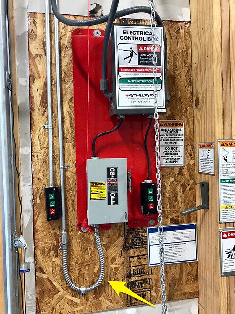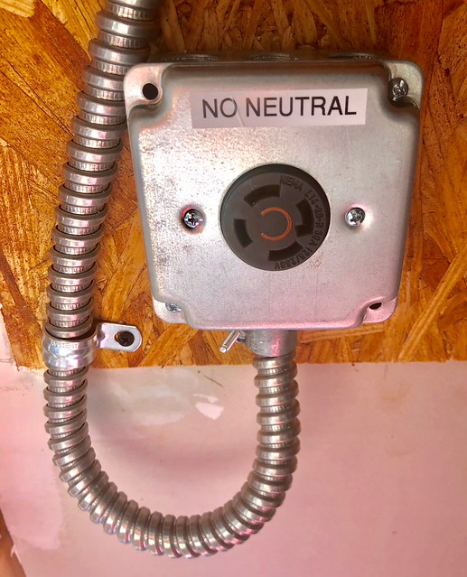 At our TN hangar home, it’s convenient that we have 240v/30A service running to our hangar door. That service is two “hots” and a ground, no neutral. At the yellow arrow: