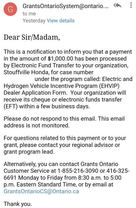 Just got an email this morning from "Grantsontariosystem" stating that they are processing the rebate submitted by my dealership by Electronic Funds Transfer for the EHVIP program and they were crediting $13k in a few business days.