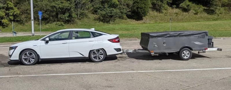 Our Clarity is a 2018, build date I think is around March. It now has a bit over 36k miles after this trip and we really haven't had any problems with it. I installed an etrailer hitch to it which was really quite painless, and then a fancy wiring harness that has the clips that go around the wires. The pop up trailer we pulled is a super lightweight 2015 LivinLite Quicksilver 8.0 - it only weighs about 850lbs with about 10% of that on the tongue. It is about a 7ft wide by 8ft long box with a couple feet of deck on the back.