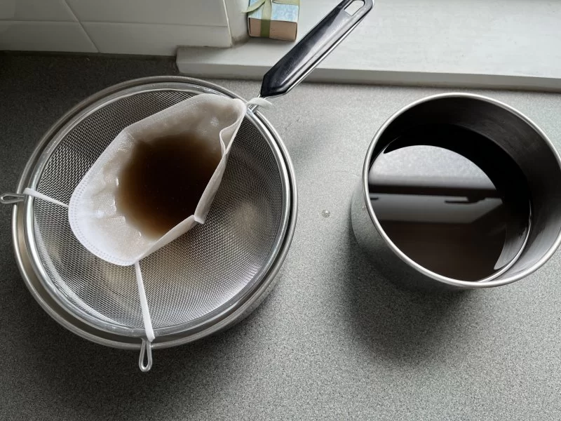 It looked darkish so I filtered it through a period-correct N95 mask over 2 hours. It didn't make too much difference to the colour and there was no obvious debris left behind in the mask.