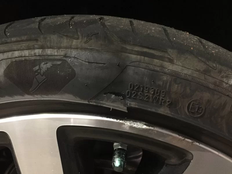 Here's the bad tire after hitting the pothole--you can see the huge bubble and the damage to the wheel--very upsetting!