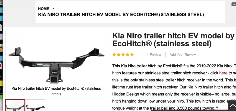 Torklift Central designed and built a couple hitches exclusively for the 2019-2022 Niro EV's; rated at 525 pounds tongue weight at the trailer ball and 3,500 pounds towing, and is a 100 percent bolt-on installation - no drilling required! Check them out: https://torkliftcentral.com/kia-niro-trailer-hitch-ev-model-by-ecohitchtm-stainless-steel