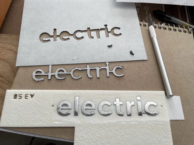 I took a photocopy of the emblem and tried to adhere it to the adhesive backing paper of the dollar store magnet sheet, then started cutting with a utility knife. It turns out that this 26 mil sheet was very thin and could easily be cut with a fine point hobby knife like an X-Acto. When I weeded out all the letters I dropped them onto the emblem, which is when I discovered one problem with my plan: the emblem ships in a die-cut piece of foam core with the backing paper on one side and transfer tape on the front… because the letters are not attached to one another! This won’t work. I paused, then took my individual magnetic letters out to the back of the car to see if they would attach strongly enough. They did not. I’m pretty sure however I affix the emblem to the back of the car with this sheet, the air back there would rip it off before I even got to the highway.