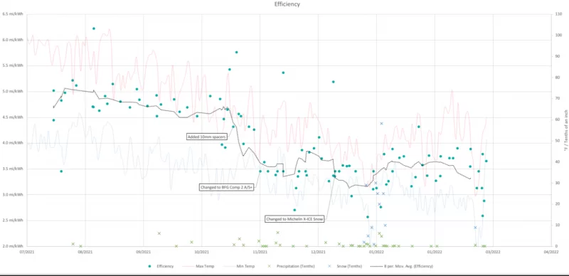 * lifetime average 12.5kWh/100km (4.972mi/kWh)