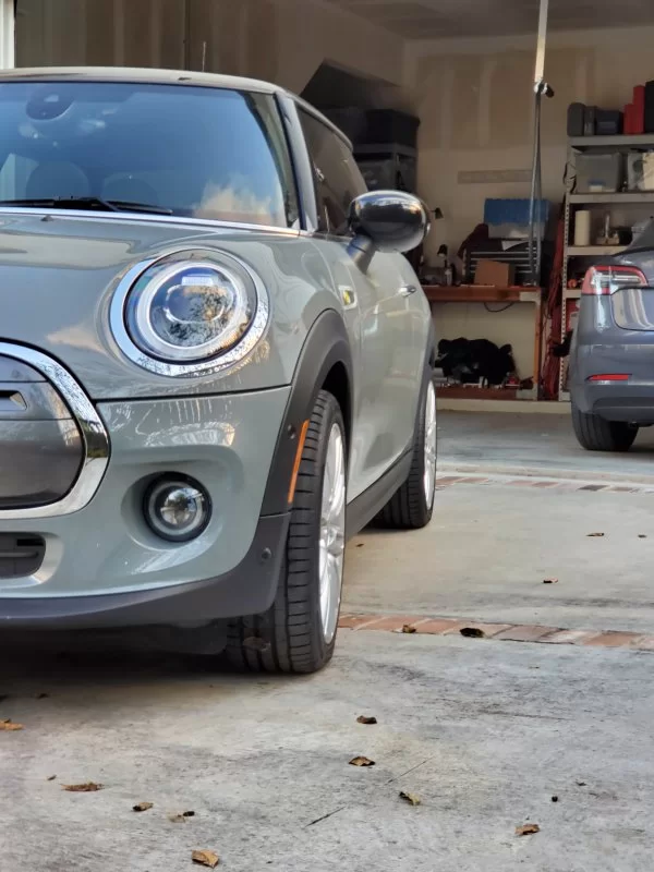 The SE is lifted is 18 mm (45/64") higher than other MINI Hardtops. To compensate visually, MINI created unique wheel-arch trim for the SE that is wider than that on other MINI Hardtops. MINI says the battery lowers the SE's center of gravity by 1.18 inches.