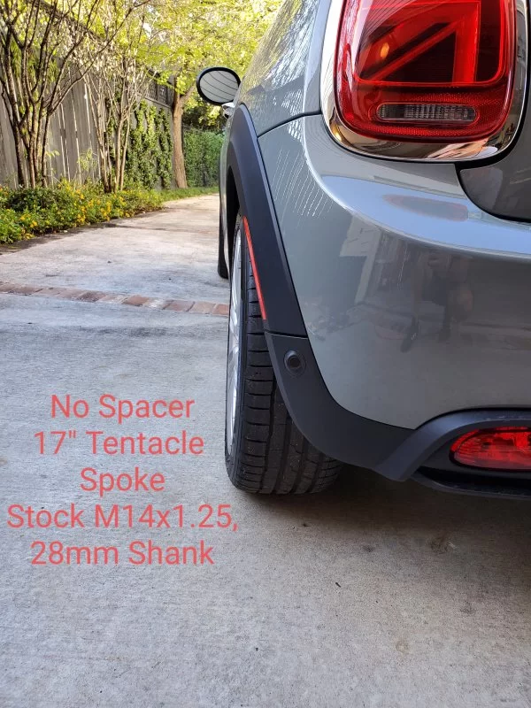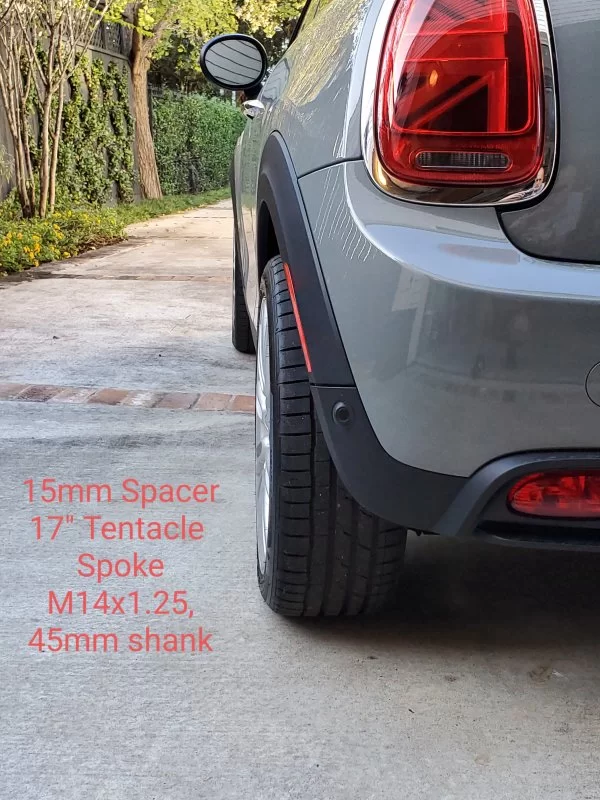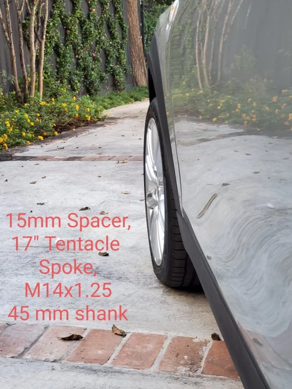 I installed spacers on Jessie, 15mm forward and aft. I like wheels to sit almost flush with the wheel well, so just a little added poke usually does the trick, without having to worry about rubbing or dramatically altering the handling (or, on the SE, the important aerodynamics).