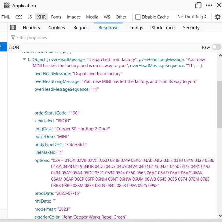 Ok so this week was the build week. Went really fast. It went from entering assembly line yesterday to dispatched from factory today - skipping "assembly in progress", "quality check", "final assembly", "ready for transport", and "awaiting carrier assignment". Status code is now 190 which apparently means awaiting transport. ProdDate bounced around from 2022-07-12 to 2022-07-15 which i see now means the final completion date.